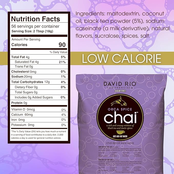 Orca Spice Reduced Calorie Chai Tea Latte Mix, 47.6 Oz, Black Tea, Organic Spices, Sugar Free, Dairy Free, Serve Hot or Cold, Just Add Water or Milk, 56 Servings, Perfect for Food Service