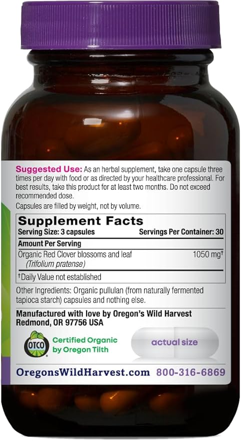 Oregon's Wild Harvest Red Clover Capsules, Non-GMO Organic Herbal Supplements, 90 Count,Organic Red Clover Blossoms and Leaf (Trifolium pratense), Non-GMO Vegan Capsules and Nothing Else