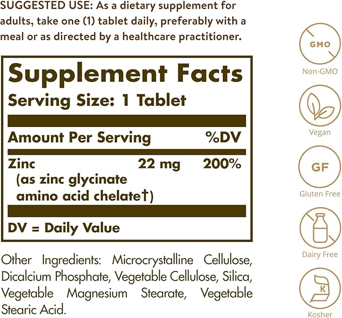 - Non GMO, Gluten Free, And Kosher; Solgar Chelated Zinc Tablets are suitable for vegans; Free of: gluten, wheat, dairy, soy, yeast, sugar, sodium, artificial flavor and sweetener