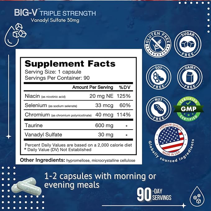 - Highly potent and reliable complex mineral supplement: Big-V provides triple strength Vanadyl Sulfate 30 mg, Taurine 600 mg, Selenium, Chromium and Niacin.