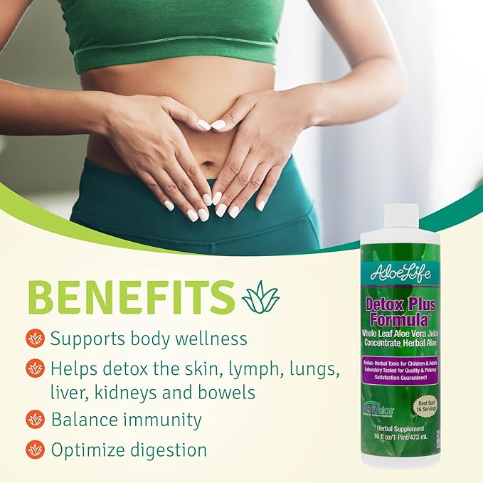 - ORGANIC ALOE DETOX: Aloe Life Detox Plus Formula is a gentle yet powerful product to support the body’s daily elimination & renewal with 10 herbal extracts in a base of Aloe Vera Leaf concentrate.