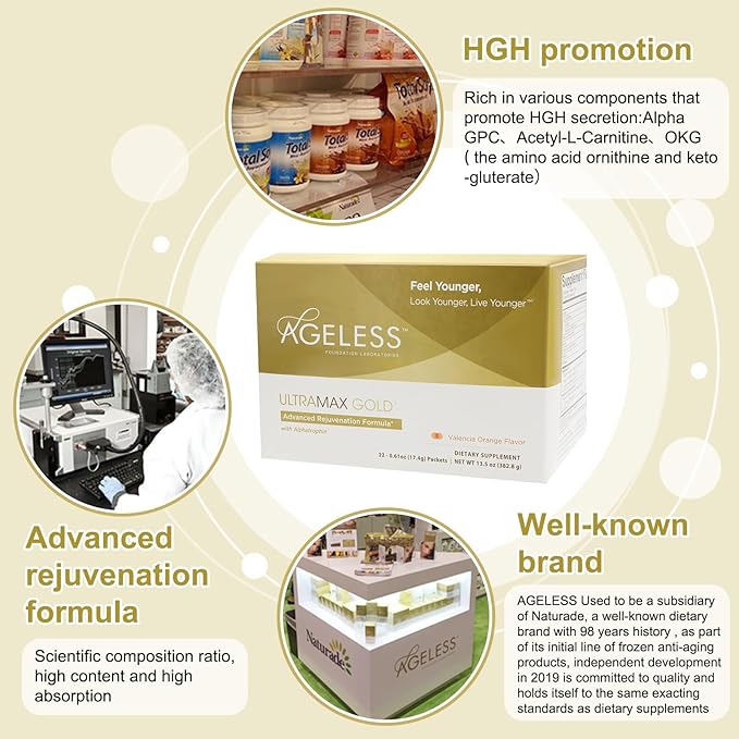 Ageless UltraMAX Gold - HGH Anti-Aging Supplement for Women & Men - Rejuvenates Skin, Restores Youthful Appearance, Boosts Energy & Sleep, Effervescent Powder - Valencia Orange Flavor - 22 Packets