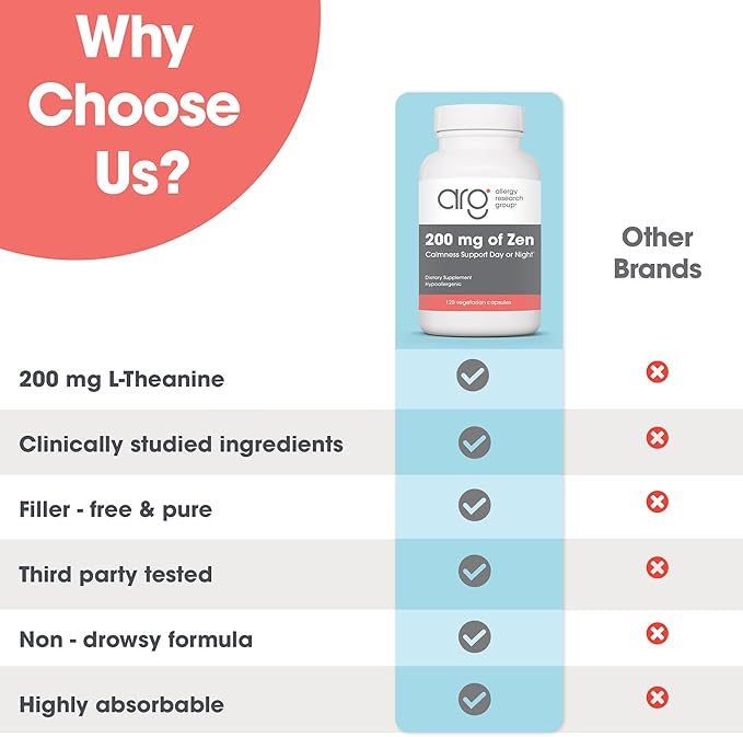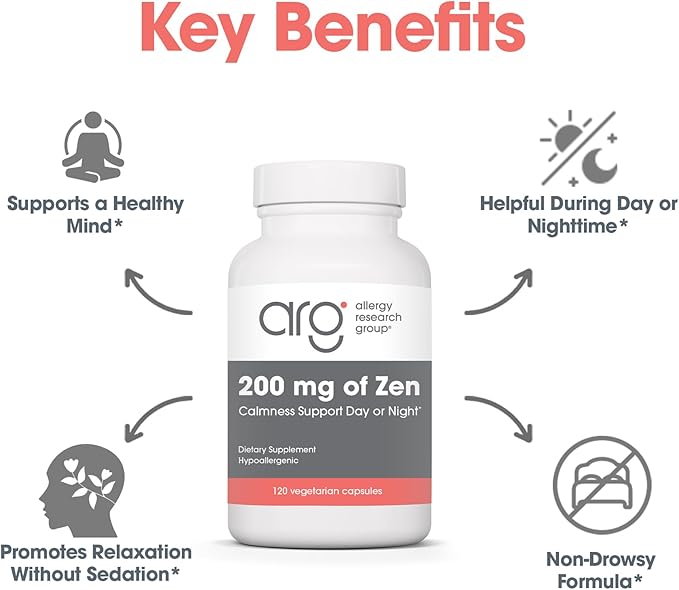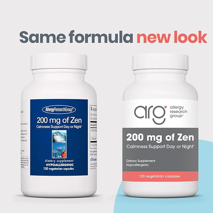- Special Ingredients : Allergy Research Group - 200mg of Zen - GABA and L-Theanine formula for calmness support Day or Night, 120 Vegetarian Capsules Allergy Research Group - 200mg of Zen - GABA and L-Theanine formula for calmness support Day or Night, 120 Vegetarian Capsules