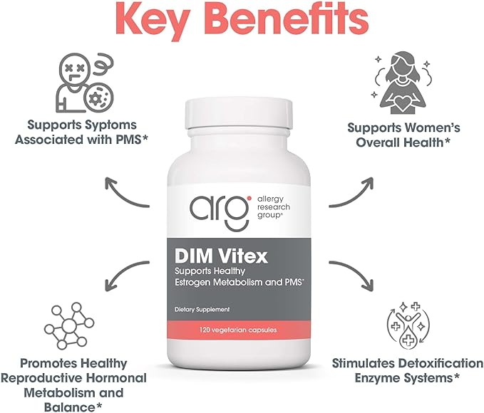 - Primary Supplement Type : Allergy Research Group DIM Vitex Supplement - Supports Healthy Hormone Balance & Menstrual Cycle, PMS Formula, Vitamin B6, Hypoallergenic, Vegetarian Capsules, Soy-Free - 120 Count Allergy Research Group DIM Vitex Supplement - Supports Healthy Hormone Balance & Menstrual Cycle, PMS Formula, Vitamin B6, Hypoallergenic, Vegetarian Capsules, Soy-Free… See more