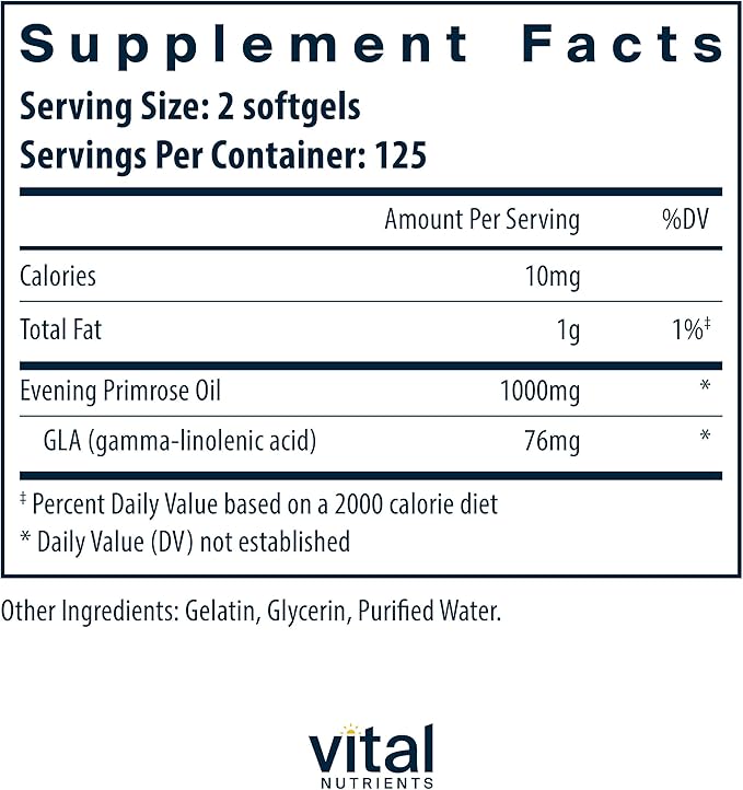 - Premium Evening Primrose Oil Supplement for Women: Vital Nutrients Evening Primrose Oil is a cold-pressed oil with GLA, an omega-6 fatty acid, supporting a range of women’s health concerns, including metabolism, heart health, cartilage, joint, and skin health and cholesterol within the normal range*