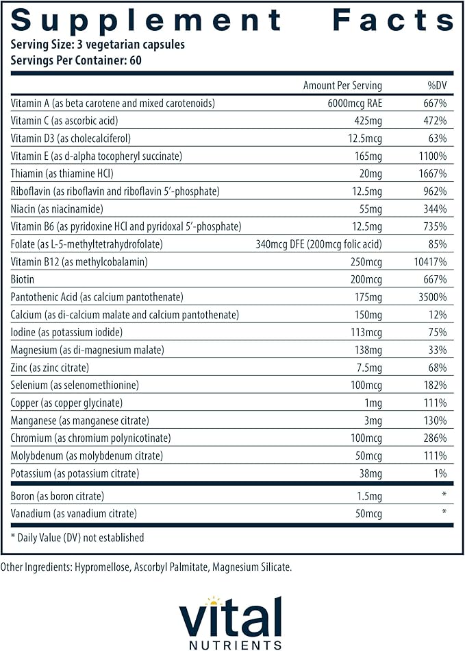 Vital Nutrients Multi-Nutrients 3|Vegetarian Multivitamin|Citrate/Malate Formula|Without Copper or Iron| Multi Vitamin, Mineral, & Antioxidant Supplement| Gluten, Dairy, Soy Free|Non-GMO|180 Capsules