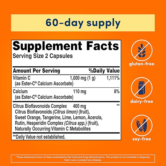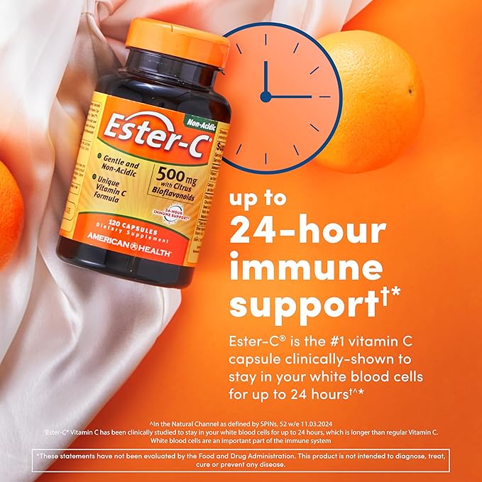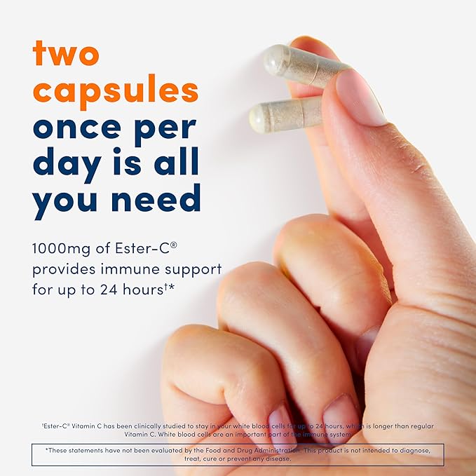 - 24-Hour Immune Support; Ester-C delivers 24-hour immune support, so one daily serving of 1000 mg is all you need; As a potent antioxidant, it helps fight free radicals, which can cause oxidative stress that may lead to the premature aging of cells