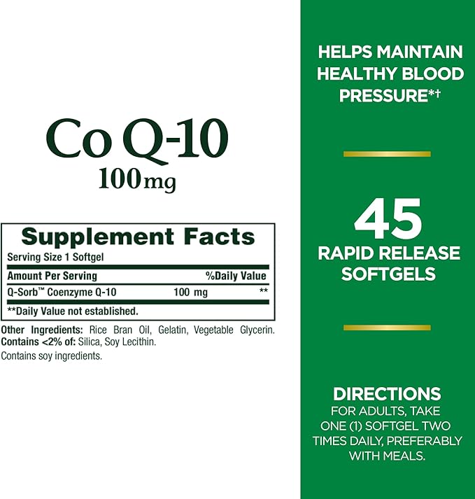 Nature's Bounty CoQ10 100mg for Heart Health Support, Non-GMO Q-Sorb Coenzyme Q-10 Antioxidant Support and Cardiovascular Wellness, Dietary Supplement, Rapid Release Softgels, 45 ct