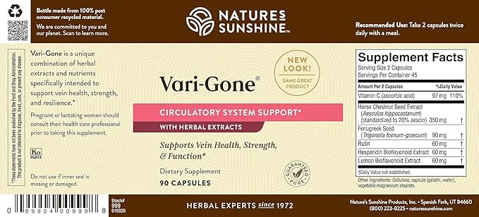Nature's Sunshine Vari-Gone, 90 Capsules, Varicose Vein Supplements with 7 Powerful Herbs and Nutrients That Support Circulation for Vein Health, Strength, and Function