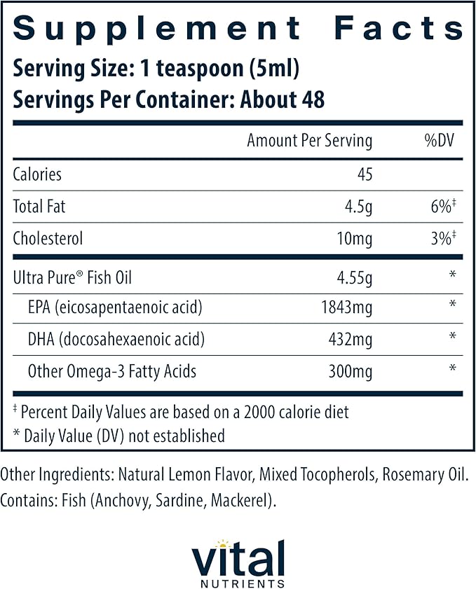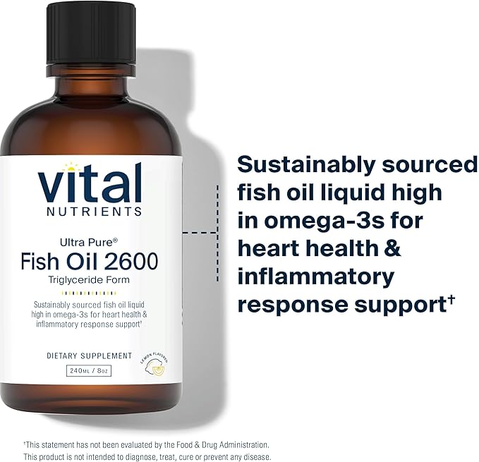 Vital Nutrients - Ultra Pure Fish Oil 2600 (Pharmaceutical Grade) - Hi-Potency Deep Sea Liquid Fish Oil, Cardiovascular Support, Natural Lemon Flavor - 8 Fl Oz per Bottle