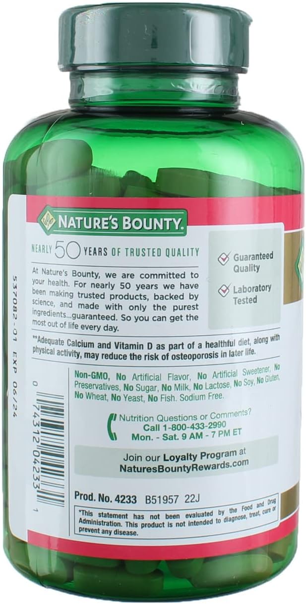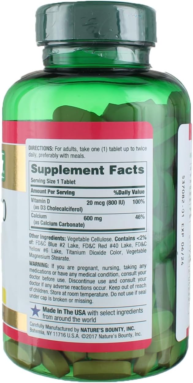 Nature's Bounty 600mg Calcium Carbonate & 800IU Vitamin D3, Supports Immune & Bone Health, 250 Count