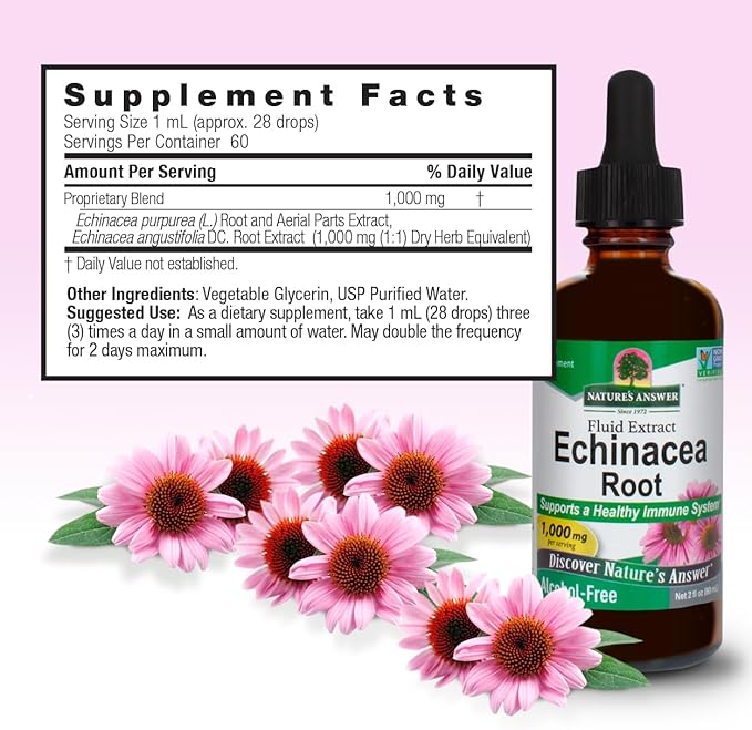 - Nature’s Answer Alcohol Free Echinacea… Echinacea (Echinacea purpurea /angustifolia) also known as purple coneflowerSupports a Healthy Immune System
