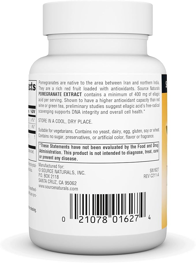 Source Naturals Pomegranate Extract 500mg Complete Whole Fruit Ellagic Acid Antioxidant & Added Fiber - 60 Tablets