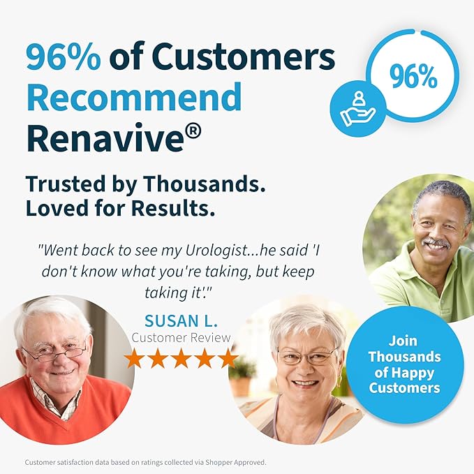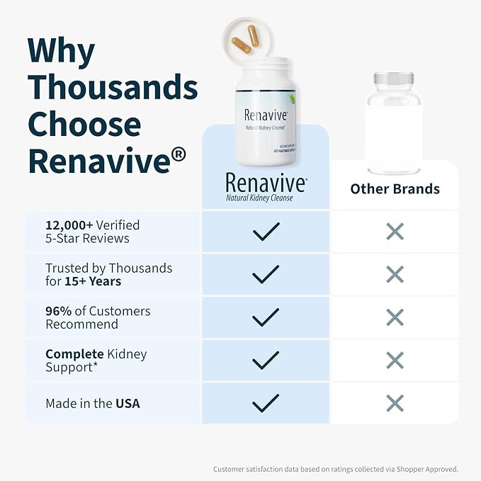 - WHY RENAVIVE? We know dealing with kidney health, particularly kidney stones, isn't always easy - on your schedule, wallet, or your peace of mind. When we developed Renavive over a decade ago, we wanted something natural & backed by science. Renavive makes it easy for you to support your kidney health. So you can stay happy, healthy and in control, always. Manufactured in the USA in a GMP-Certified facility. Bonus, our ingredients are natural right down to the vegetarian capsule!