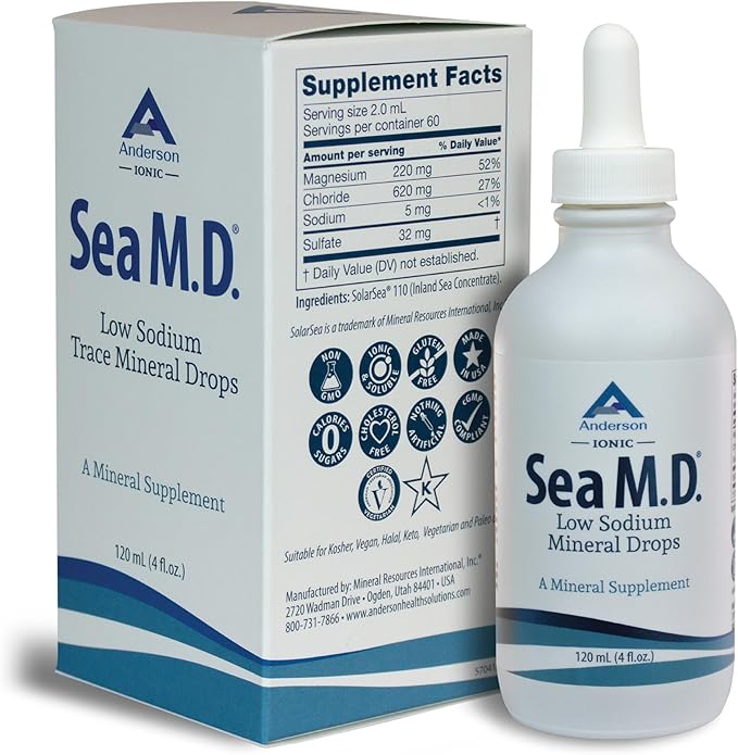- Original, Pure, Natural - Ionic, electrolyte, magnesium-rich Anderson Sea MD is the low-sodium sea mineral formula from Utah’s Great Salt Lake. Used by millions world wide, it is simple and natural - just solar evaporated, concentrated sea water