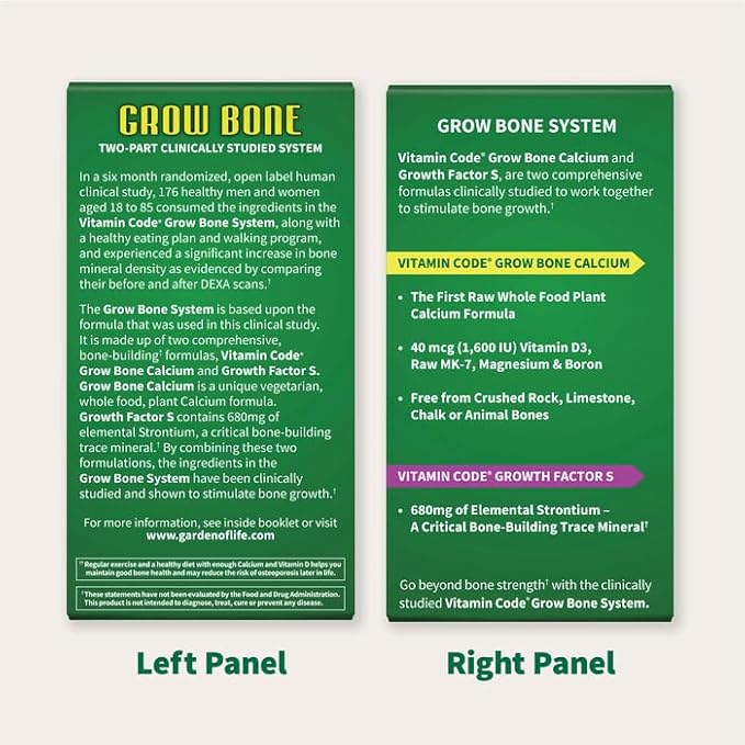 - BONE UP WITH CLINICALLY STUDIED FORMULAS: 756mg raw, plant-based Vitamin Code Grow Bone AlgaeCal Calcium—plus trace minerals—and 680mg Growth Factor S elemental (absorbable) strontium