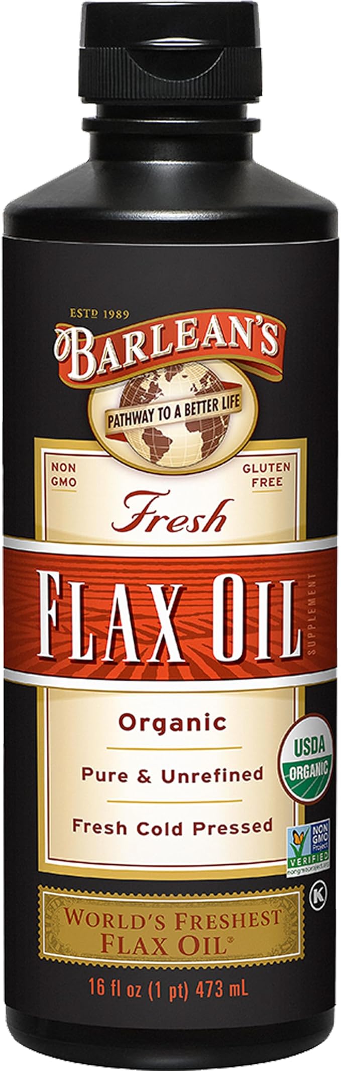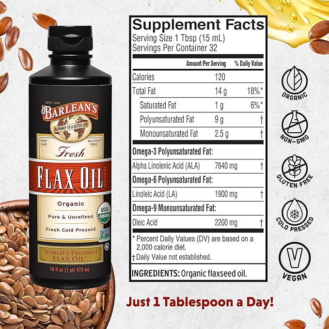 Barlean's Organic Flaxseed Oil Liquid from Cold Pressed Flax Seeds, 7,640mg ALA Omega 3 Fatty Acid Supplement for Joint and Heart Health, Vegan & Gluten Free, 16 oz