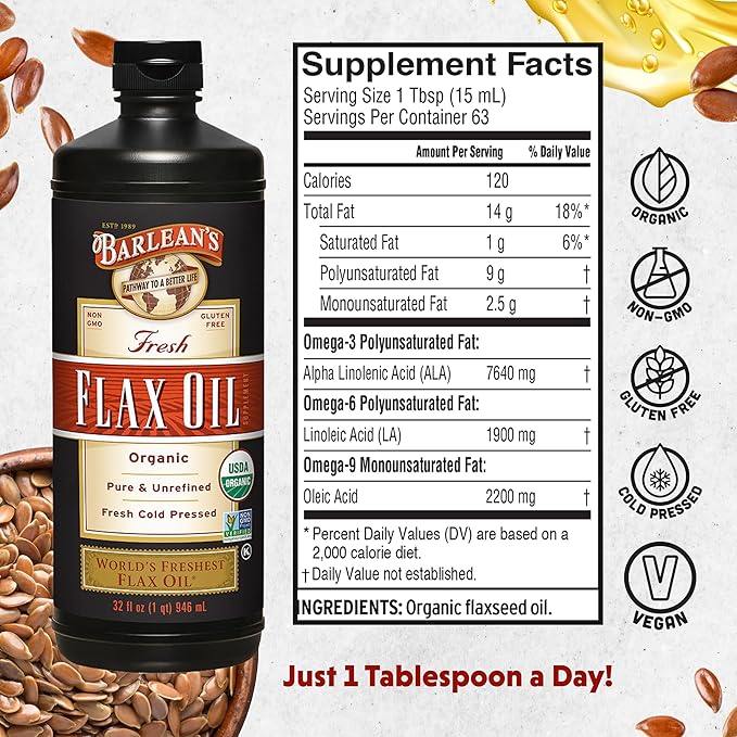 Barlean's Organic Flaxseed Oil Liquid, Cold Press Flax Seeds, 7,640mg ALA Omega 3 Fatty Acid Supplement for Joint and Heart Health & Healthy Digestion, 32 oz