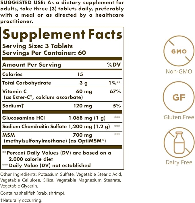 - Gluten, Wheat & Dairy Free; Solgar Extra Strength Glucosamine Chondroitin MSM with Ester-C is non-GMO, and free of: gluten, wheat, dairy, soy, yeast, sugar, artificial flavor, sweetener, and color