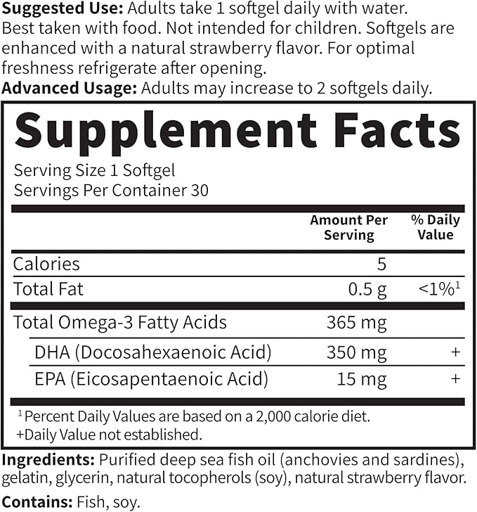 - OCEANS MOM PURE PRENATAL DHA: Nothing fishy here! Just 350mg of Omega 3 DHA—optimum for pregnant or breastfeeding women—plus 15mg of EPA in a small, once daily strawberry flavored softgel that is easy to swallow and pleasant to take (no fishy taste)