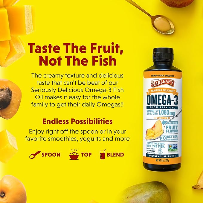 Barlean's Mango Peach Omega 3 Fish Oil Liquid Supplement with Vitamin D, 1080mg EPA & DHA Fatty Acid, Smoothie Flavored & Burpless for Brain, Joint, & Heart Health, 8 oz