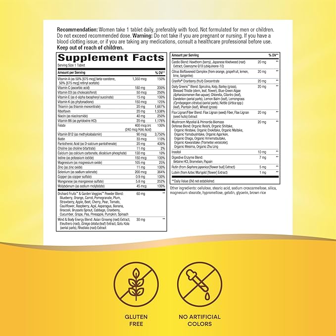 - Women take 1 tablet daily, preferably with food; women's daily multivitamin