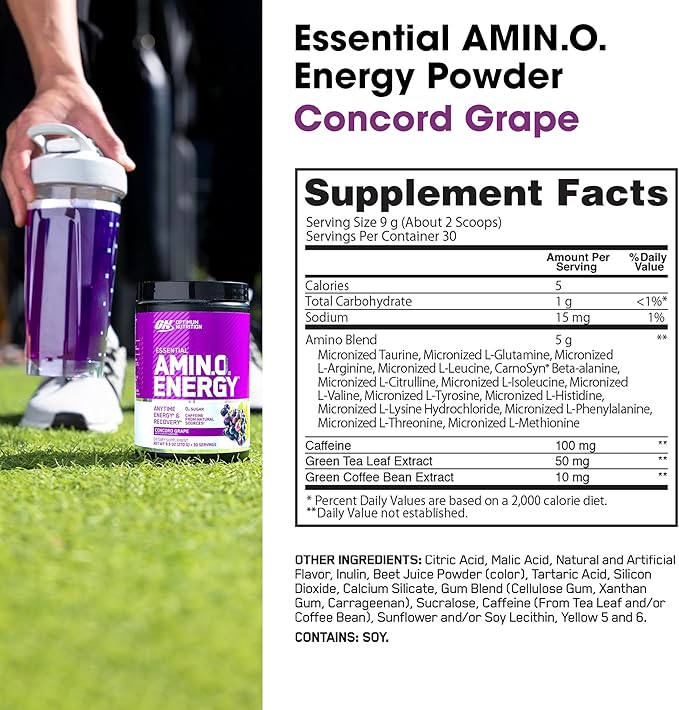 Optimum Nutrition Amino Energy - Pre Workout with Green Tea, BCAA, Amino Acids, Keto Friendly, Green Coffee Extract, Energy Powder - Concord Grape, 30 Servings