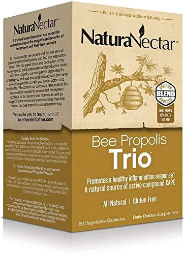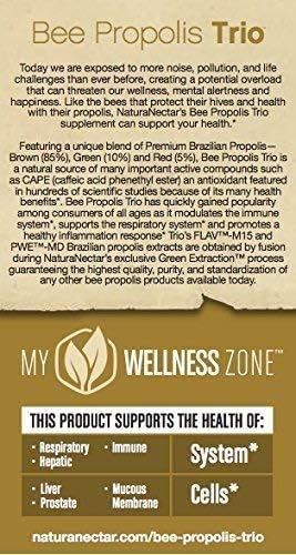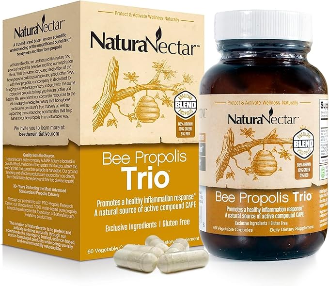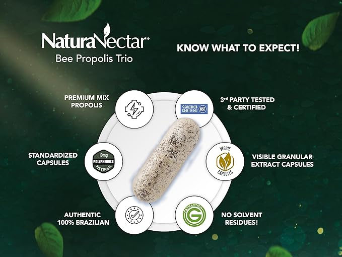 - AMAZING BEE PROPOLIS TRIO: NaturaNectar Trio Bee Propolis combines pure, premium Brazilian products with 85% brown, 10% green, and 5% red bee propolis, offering exclusive benefits like antioxidants and health support. These gluten-free capsules provide a bee powered daily health support and promote overall well-being. Suitable for adults, this NSF-certified supplement delivers the natural potency of bee propolis in easy-to-take capsules, perfect for daily vitality and enhanced wellness.