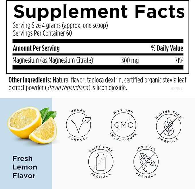 - Flexible, Convenient Dosing - Pill free and great-tasting. This lemon flavored powder mixes well in water and contains 300 mg of Magnesium Citrate per teaspoon. The convenient powder makes it easy to adjust your dosage.*