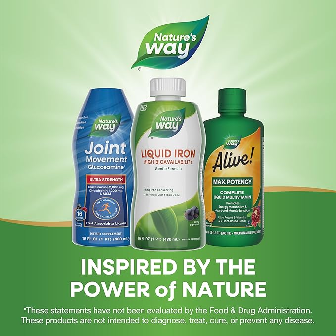 Nature's Way Liquid Iron, 100% Daily Value, 18 mg Iron as Ferric Glycinate per Serving, No Sugar Added, Berry Flavored, 16 Fl Oz (Packaging May Vary)