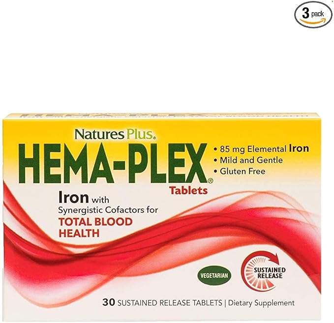 NaturesPlus Hema-Plex Iron - 30 Slow-Release Tablets, Pack of 3 - Total Blood Health - 85 mg Chelated Iron - With Vitamin C & Bioflavonoids - Non GMO, Vegetarian & Gluten Free - 90 Total Servings