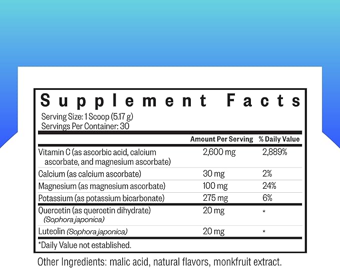 - Targeted support: Each teaspoon offers 2569 mg of buffered vitamin C along with naturally-occurring bioflavonoids in a great tasting effervescent powder. Sweetened with all natural flavors, xylitol and stevia leaf extract