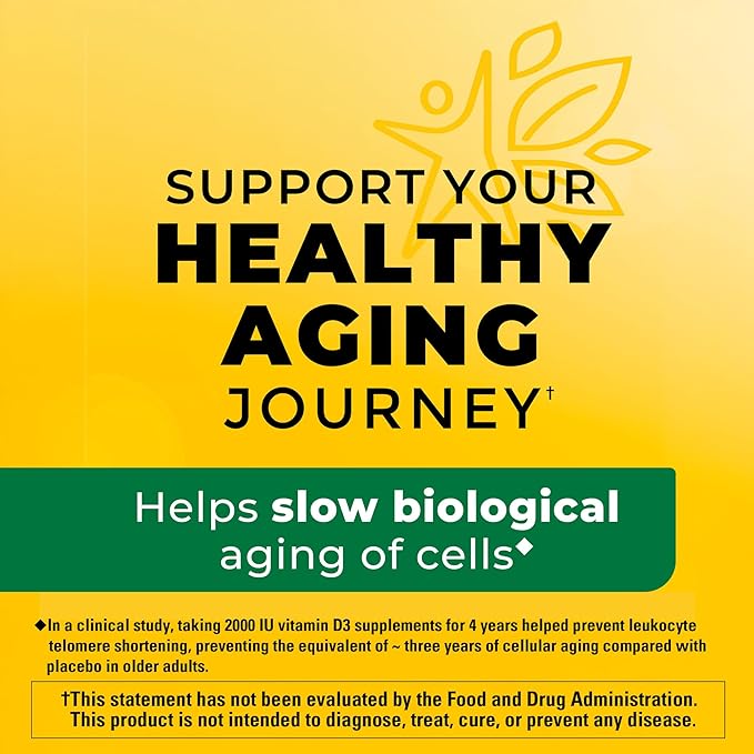 - Helps slow biological aging of cells; In a clinical study, taking 2000 IU vitamin D3 supplements for 4 years helped prevent leukocyte telomere shortening, preventing the equivalent of approx 3 years of cellular aging compared with placebo in older adults