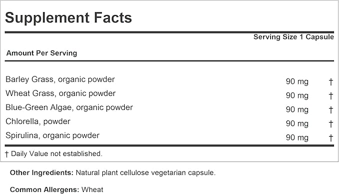 - Superior pure bio-active ingredients - Packed with 100 milligrams each of Barley Grass, Wheat Grass, Blue Green Algae, Chlorella and Spirulina. Contains no Milk / Dairy free. Gluten Free; no soy, yeast, corn, sodium, salt, sugar, fat, cholesterol, color, preservative or manufacturing additives.