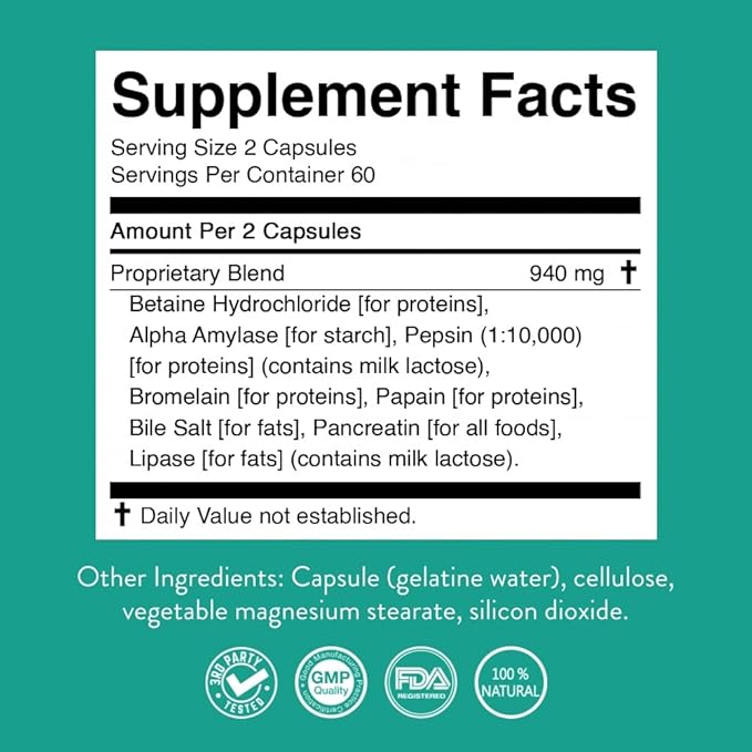 - POWERFUL FOOD ENZYMES - Enjoy digestive relief with a powerful, proprietary blend of enzymes for digestion. Take two easy-to-swallow capsules before or after every meal. Ingredients such as betaine HCI, bromelain, lipase, pepsine, and bile salts help your body efficiently break down food.