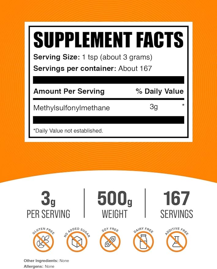 - Maximize your Potential: Enhance your active lifestyle with our MSM supplement in MSM powder, designed to support your strength and performance goals. Each serving delivers a substantial 3000mg dose, catering to both fitness enthusiasts looking to push their limits.