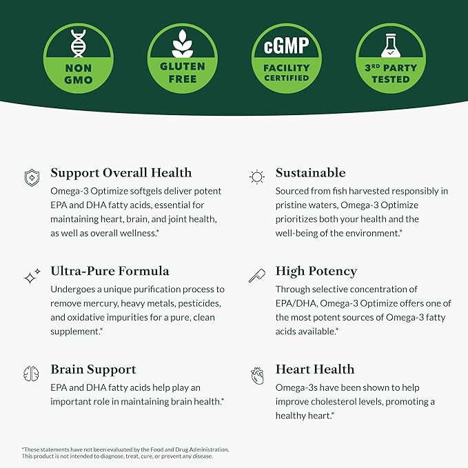 - Supports Overall Health & Well-Being. Omega-3 Optimize softgels deliver potent EPA and DHA fatty acids, essential for maintaining heart, brain, and joint health, as well as overall wellness.