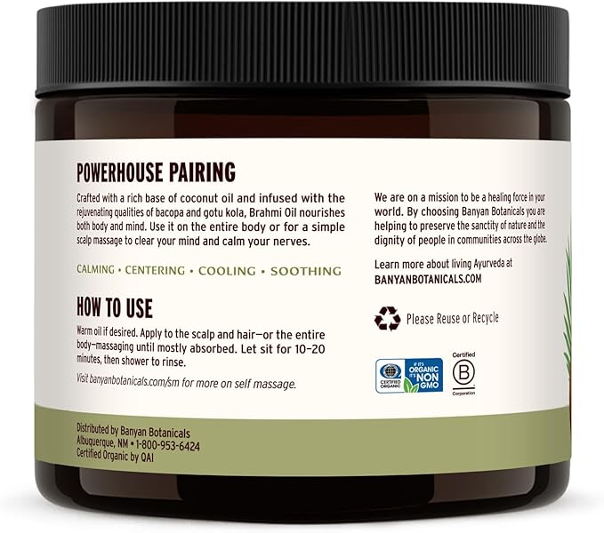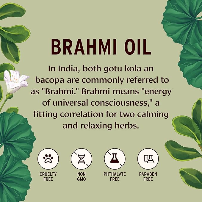 - BRAHMI OIL consists of an organic coconut oil base that has been infused with organic brahmi (gotu kola) and organic bacopa, two Ayurvedic herbs renowned for their calming properties. The result is a balancing and grounding massage oil perfect for full body massage.
