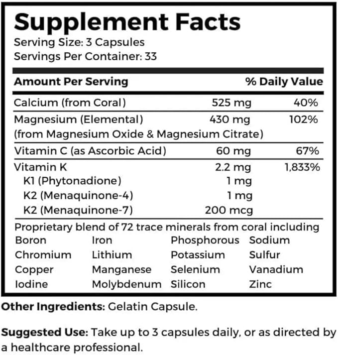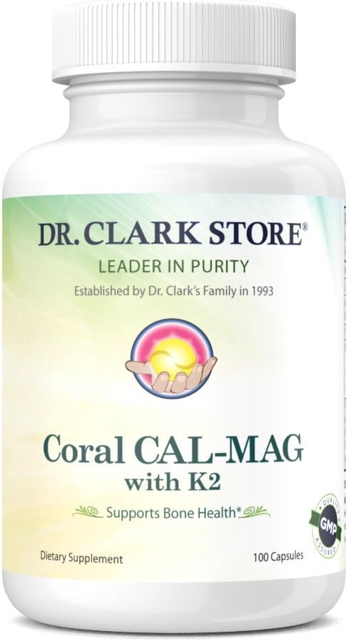 Dr. Clark Store Coral Cal-Mag K2 – 993mg, 100 Gelatin Capsules, Supports Bone Health, pH Balance, 72 Trace Minerals & Vitamin K