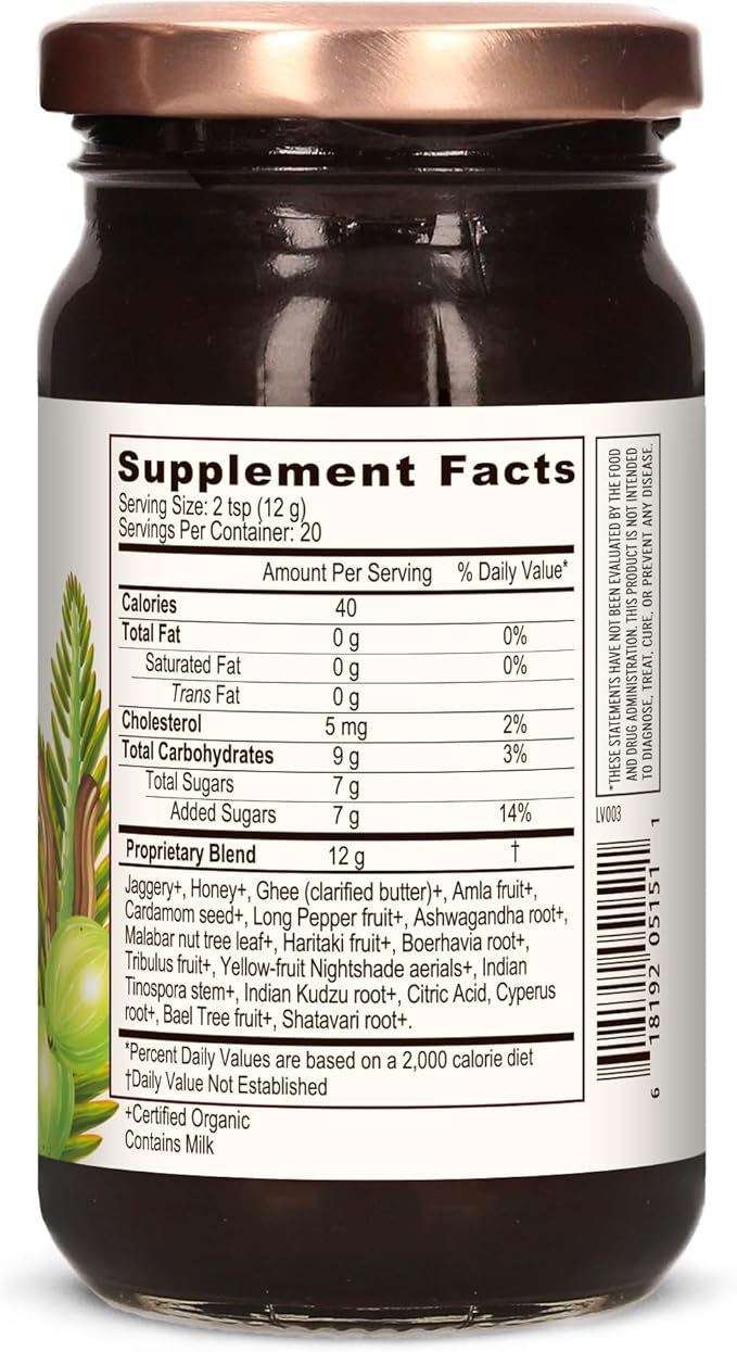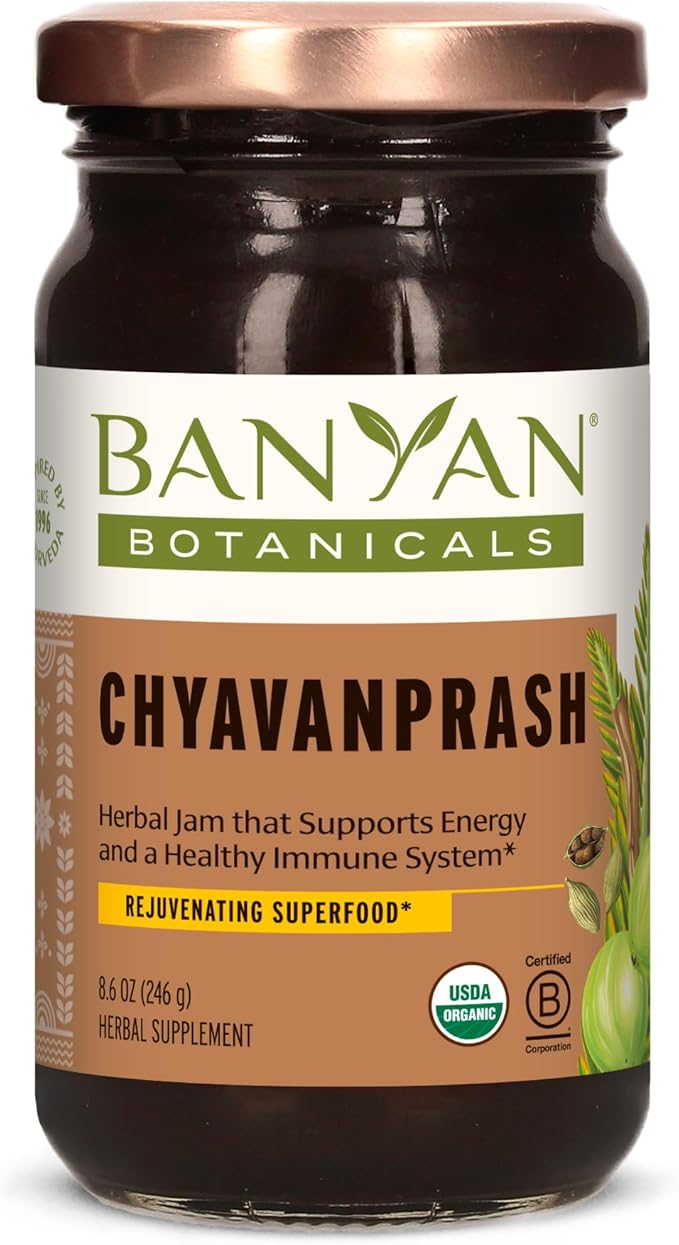 - A SOURCE OF NATURAL ANTIOXIDANTS, Chyavanprash is packed with rejuvenating herbs, including the famous adaptogens amla (amalaki fruit), ashwagandha, guduchi, and shatavari. Organic raw honey, ghee, and jaggery (unrefined cane sugar) help carry the herbs deep into the tissues.*