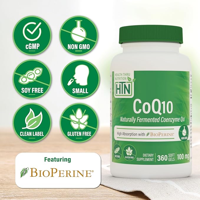 Health Thru Nutrition CoQ-10 100mg with BioPerine 360 Softgels | High Absorption Naturally Fermented USP Grade Coenzyme Q10 Supplement | 3rd Party Tested | Heart Health and Energy Support