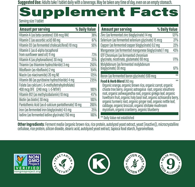 - All of our multivitamins are made with food-paired vitamins and fermented minerals, and can be taken any time of day, even on an empty stomach. 1 tablet daily