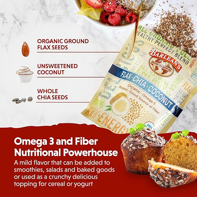 Barlean's Organic Flax Chia Coconut Seed Blend with 2,330 mg Omega 3 Fatty Acids, Fiber Supplement with Whole Chia Seeds and Ground Flaxseed, 12 oz