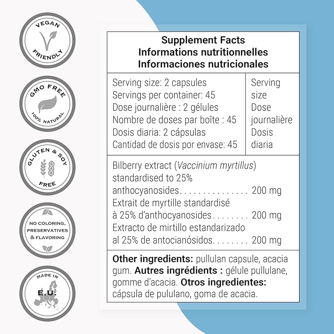 - Recommended Use - Take 2 capsules a day. Each vegetarian capsule contains 100 mg of bilberry extract. Contains bilberry extract (vaccinium myrtillus) standardized to 25% anthocyanosides. | Other ingredients: acacia gum, white rice bran.