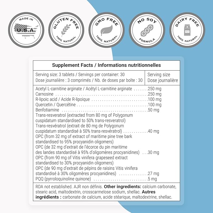 - π¬ CONTAIN: Acetyl L-carnitine arginate, Carnosine, R-lipoic acid, Quercetin, Benfotiamine, Trans-resvΓ©ratrol, OPC, OPC, PQQ | Other ingredients : calcium carbonate, stearic acid, maltodextrin, shellac.