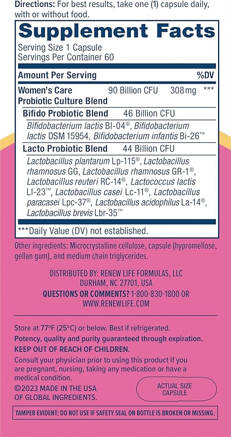 - WOMEN'S PROBIOTIC: Includes one 60-count bottle of Renew Life Women's Care Probiotic Capsules 90 Billion CFU for vaginal, urinary, digestive and immune support (1)