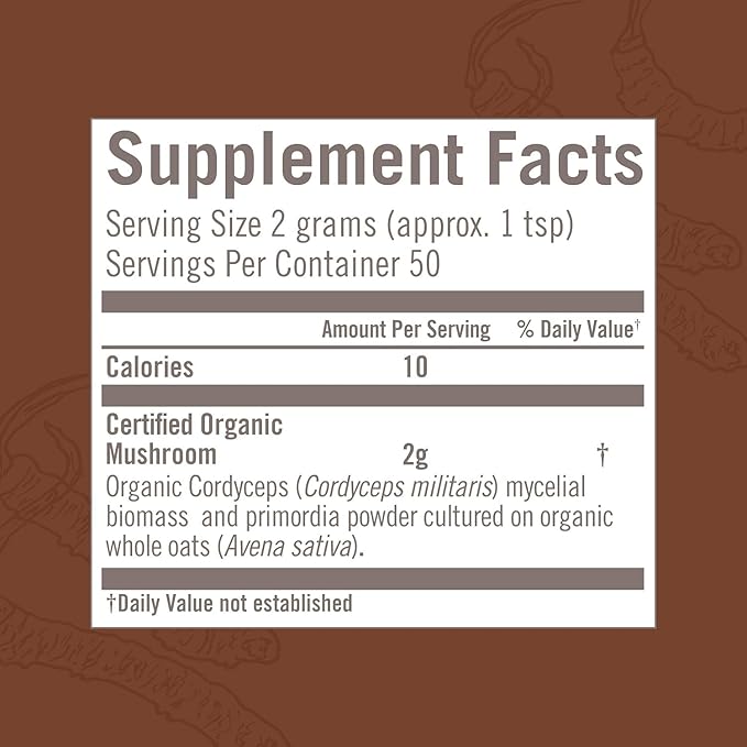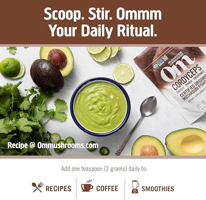 - Om Mushroom Superfood Cordyceps Organic Mushroom Powder: Contains one 3.5 ounce pouch (50 servings) of 100% certified organic mushroom cordyceps militaris fruit body and mycelial biomass powder cultured on organic oats for energy, stamina and energy