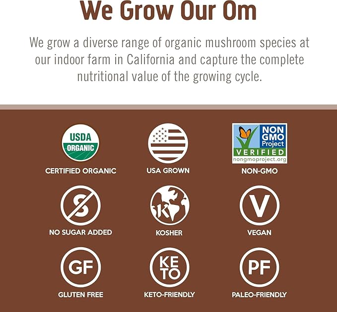 - USA Grown the Om Way: Om Mushroom Superfood Powders, Capsules, Hot Drinks, Energy Drinks and Broths are all produced in the USA. We grow, dry and mill our organic mushrooms into powders in our state of the art facilities in Southern California, to ensure the highest quality, and verify using 3rd-Party Testing. Om Mushroom powders are USDA Certified 100% organic, non-GMO, gluten-free, vegan, grown in the USA, paleo-friendly, keto-friendly, kosher