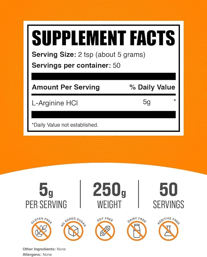 - Optimized in every Serving: Our L-Arginine HCl powder, in Arginine 5g, is unflavored and free of unnecessary allergens, offering you a high-quality product that easily integrates with other supplements or your preferred shake or beverage.