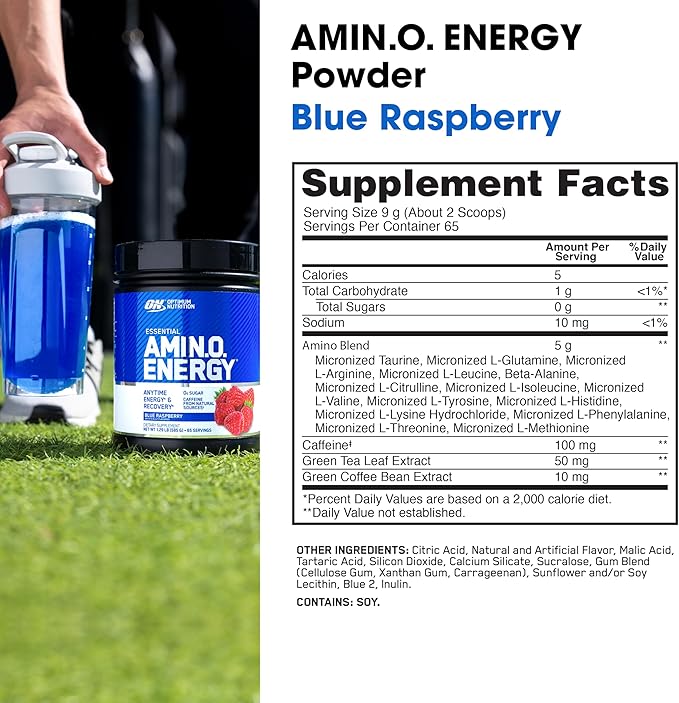 Optimum Nutrition Amino Energy - Pre Workout with Green Tea, BCAA, Amino Acids, Keto Friendly, Green Coffee Extract, Energy Powder - Blue Raspberry, 65 Servings (Packaging May Vary)